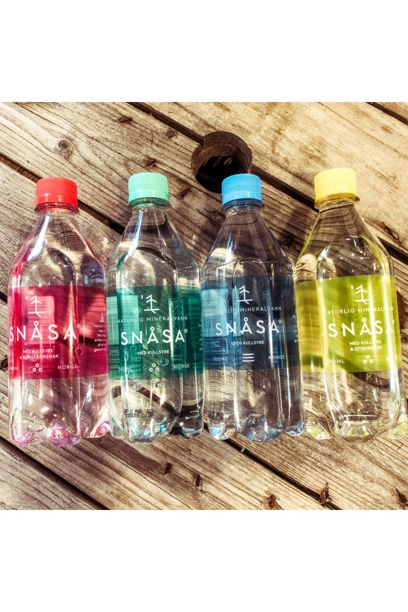Gjelder alle halvlitersflasker (0,5 ltr) med mineralvann, med og uten kullsyre. Vi anbefaler gjerne Snåsavann som finnes i 4 ulike typer.